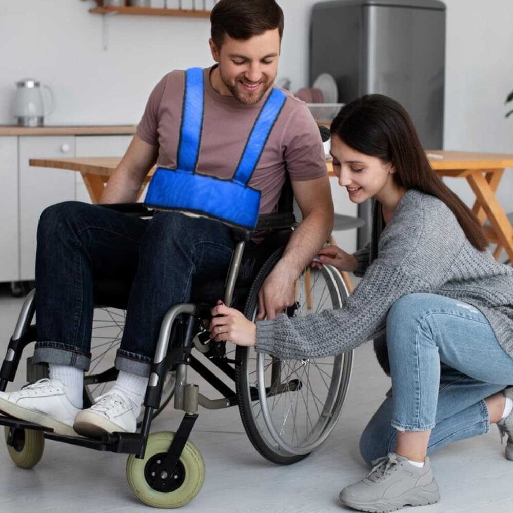 A secure and comfortable safety harness for wheelchairs – designed to help prevent slipping or leaning forward, offering added peace of mind for carers and loved ones.