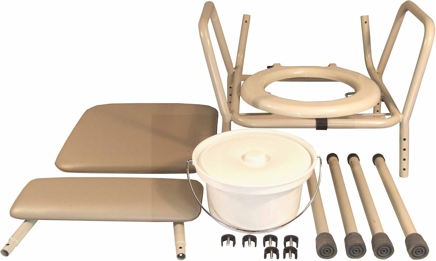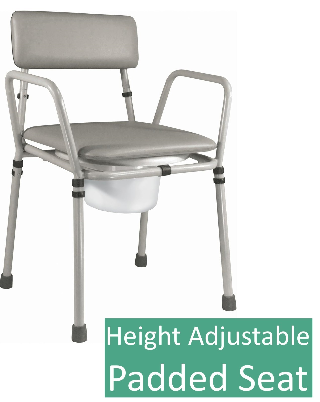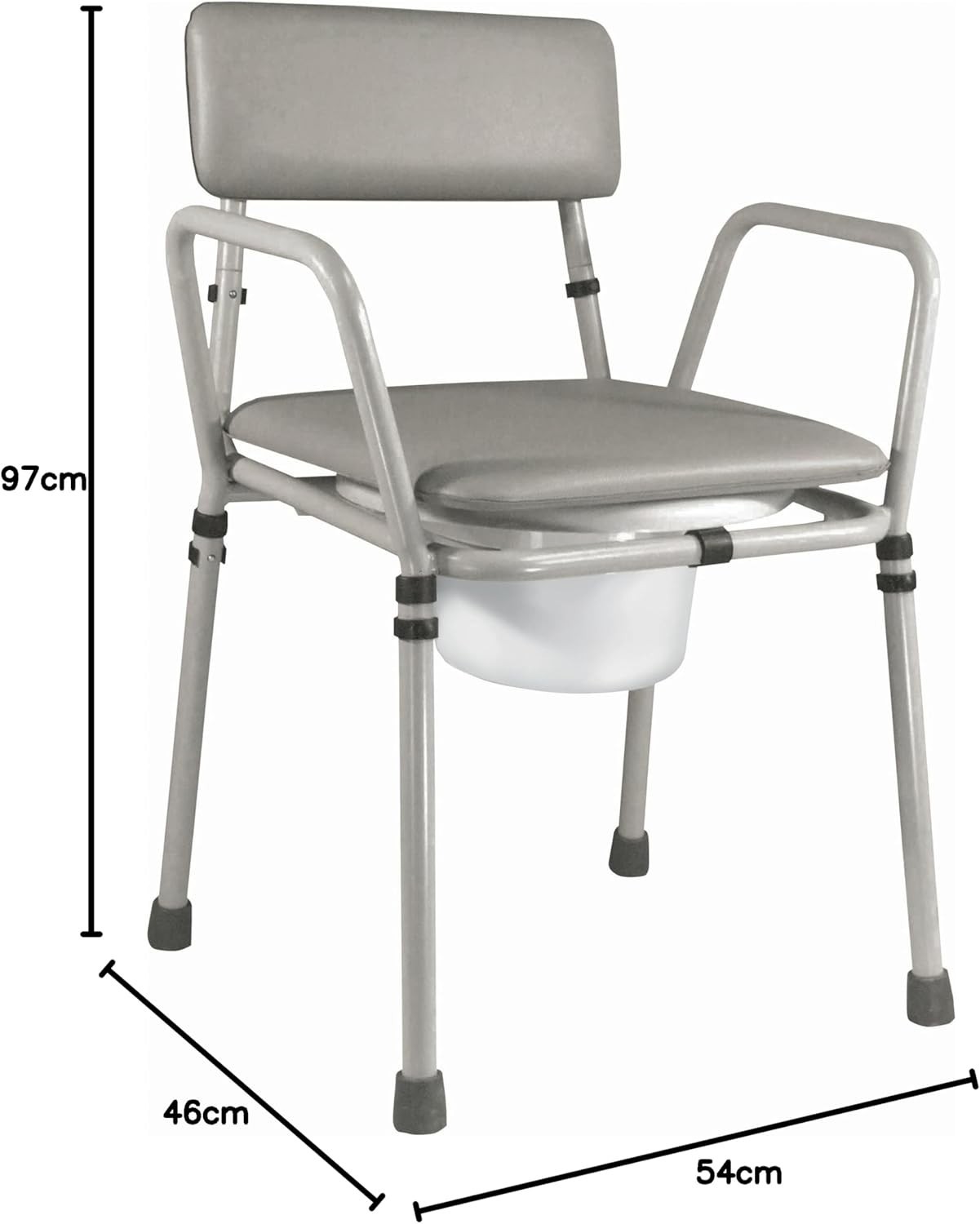 A discreet, supportive bedside commode for the bedroom or home – height adjustable with padded seat, arms and backrest, flip-up toilet seat, and removable bucket.