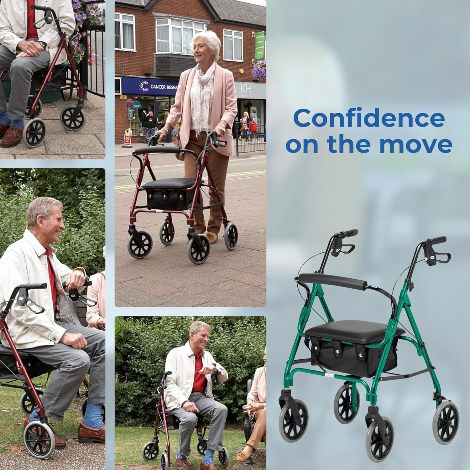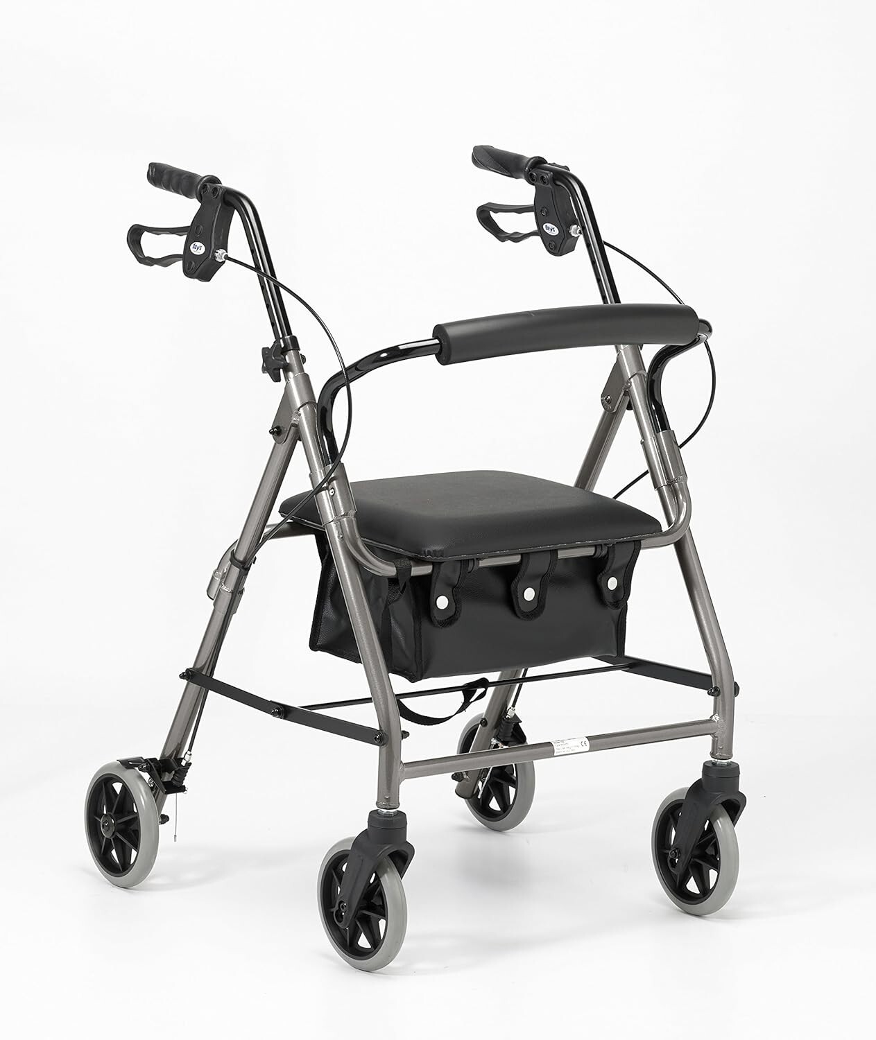 Lightweight aluminium rollator with padded seat for comfort on the go