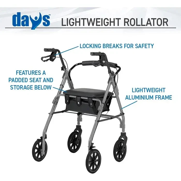 Days Lightweight Folding Rollator Walker with Seat – Quartz (Large)