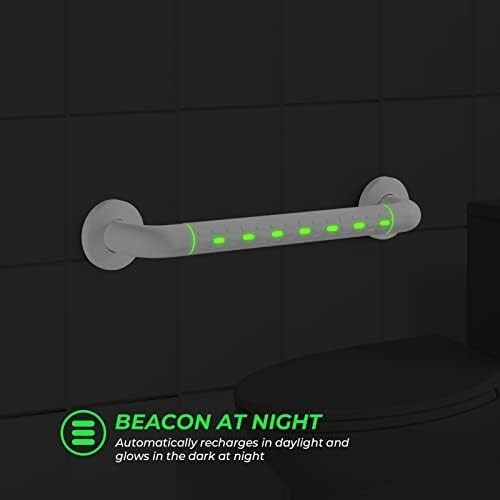 A modern, stainless steel grab rail designed for safe and secure support in the bathroom – complete with non-slip grip and a luminous guide for visibility in low light.