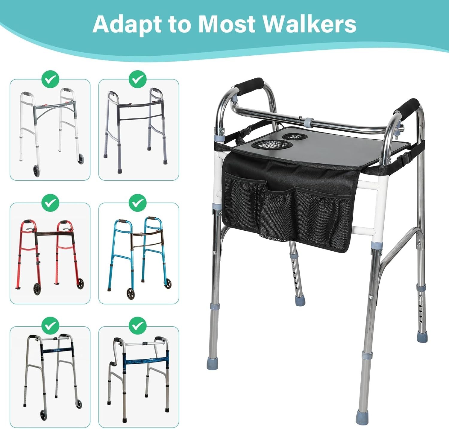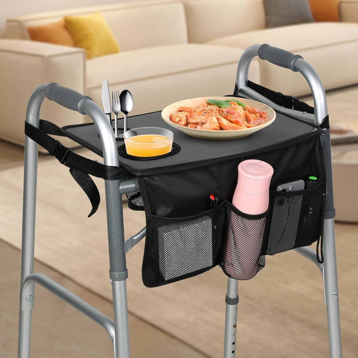 Walker Tray with Cup Holders & Storage Pocket – Detachable Accessory for Standard Walker