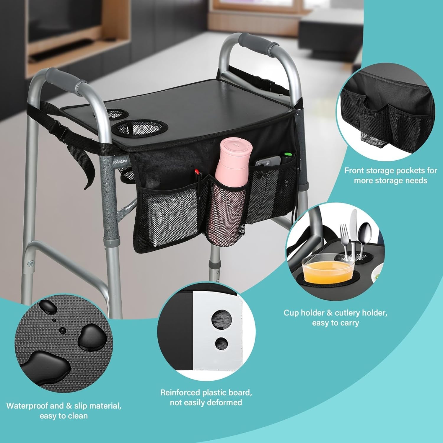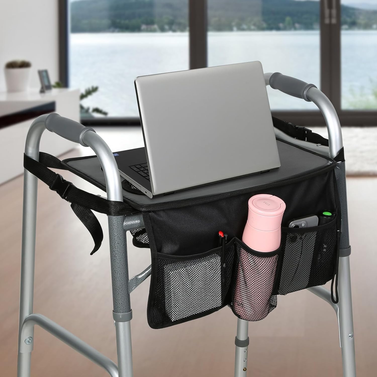 Turn your walker into a convenient tabletop and organiser – ideal for eating, reading, or moving items around the house.